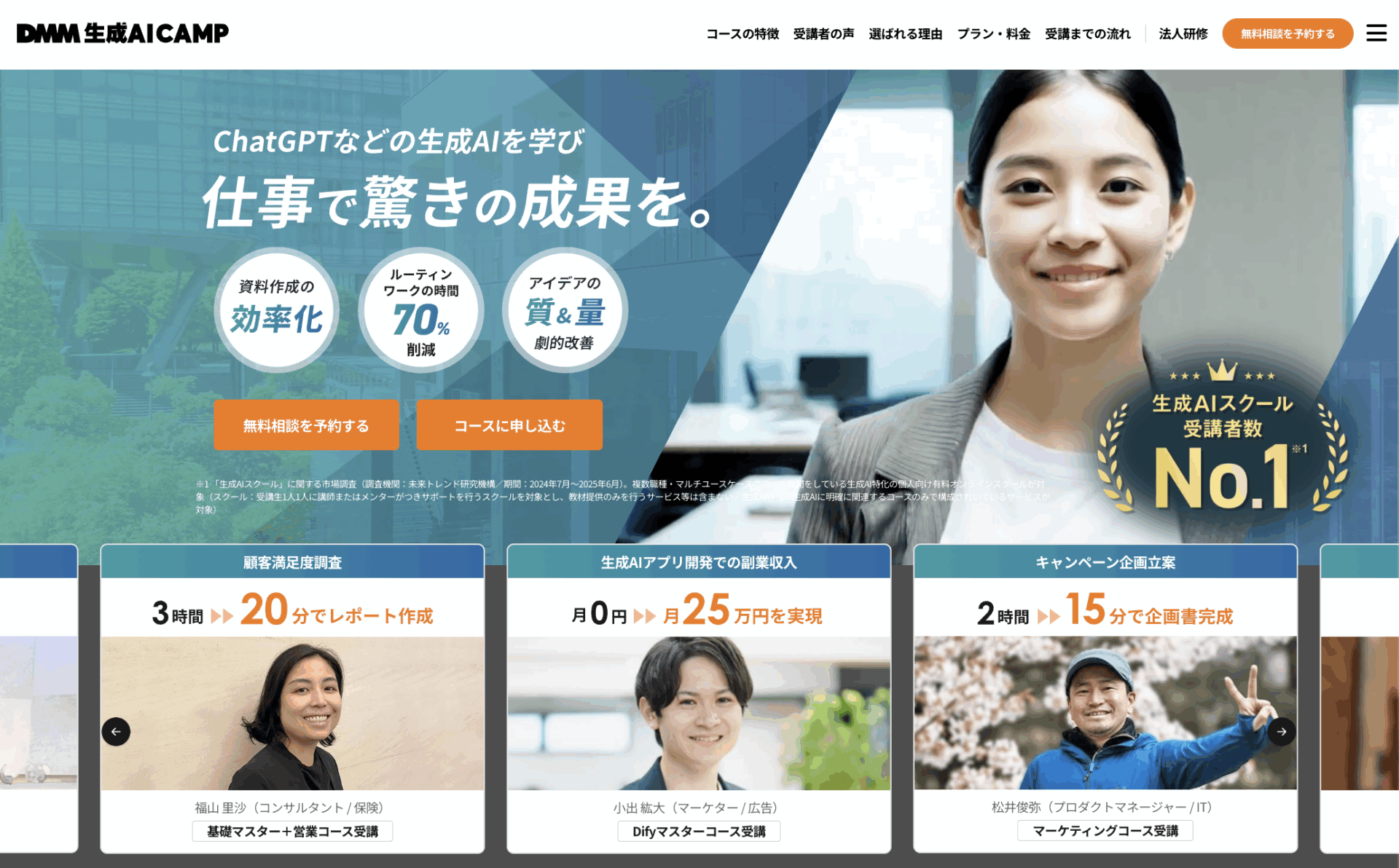 DMM生成AI CAMPの最大の特徴は、ビジネス現場で即戦力となるスキルを、短期間で効率よく学ぶ、という点にあります。