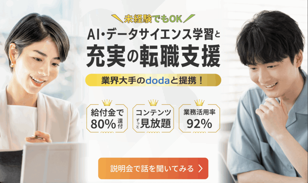キカガクは、Pythonプログラミングやデータ分析、機械学習など、DX推進に必要なスキルを体系的に学べるスクールです。給付金で最大80%の受講費用が還付されます。転職エージェントdodaと提携しており、AI転職を目指す社会人に選ばれているスクールです