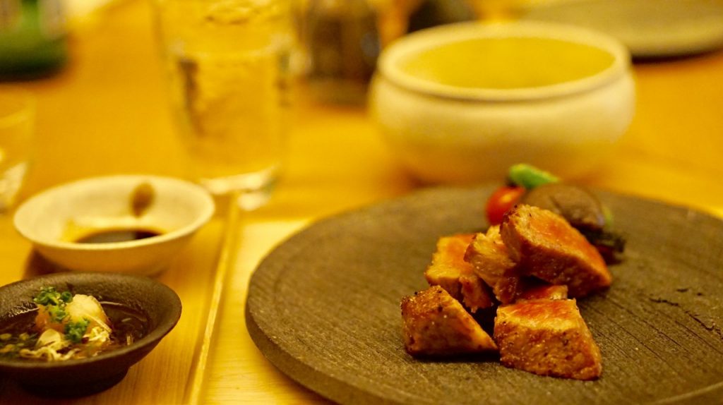 夕食はプラン専用のコースでいただきます。メインは伊勢志摩のブランド牛「伊賀牛」をステーキで食べるか、すきやきで食べるかを選ぶことが出来ました。